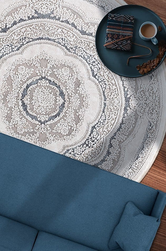 Etnik Desenli Halı Dekhera Warble 5810 Beyaz Mavi Daire