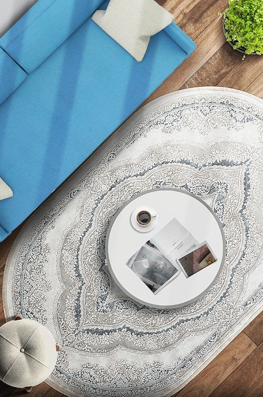 Etnik Desenli Halı Dekhera Warble 5810 Beyaz Mavi Oval