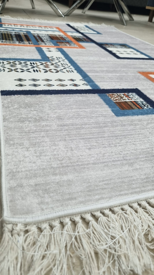 Gri çerçeveli halılar, odanızda farklı bir vurgu noktası oluşturmak için kullanabileceğiniz şık bir seçenektir. Genellikle farklı renkteki çerçevelerle tasarlanan bu halılar, zarif bir kontrast oluşturur ve mekânınıza görsel bir çekicilik katmada etkilidir.